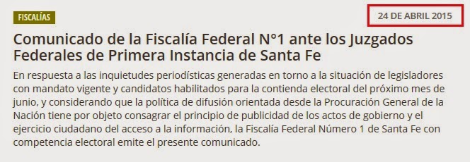El 24 de abril de 2015, el fiscal lanzó un nuevo comunicado: "En respuesta a las inquietudes periodísticas generadas en torno a la situación de legisladores con mandato vigente y candidatos habilitados para la contienda electoral del próximo mes de junio, y considerando que la política de difusión orientada desde la Procuración General de la Nación tiene por objeto consagrar el principio de publicidad de los actos de gobierno y el ejercicio ciudadano del acceso a la información, la Fiscalía Federal Número 1 de Santa Fe con competencia electoral emite el presente comunicado".